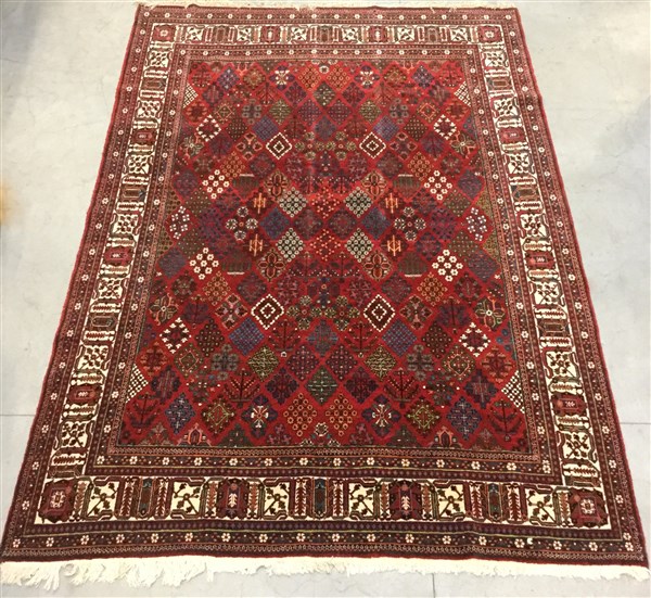 Decoro all-over con motivi romboidali floreali policromi. Bordura a fondo bianco (cm 332x237) (Lievi difetti)