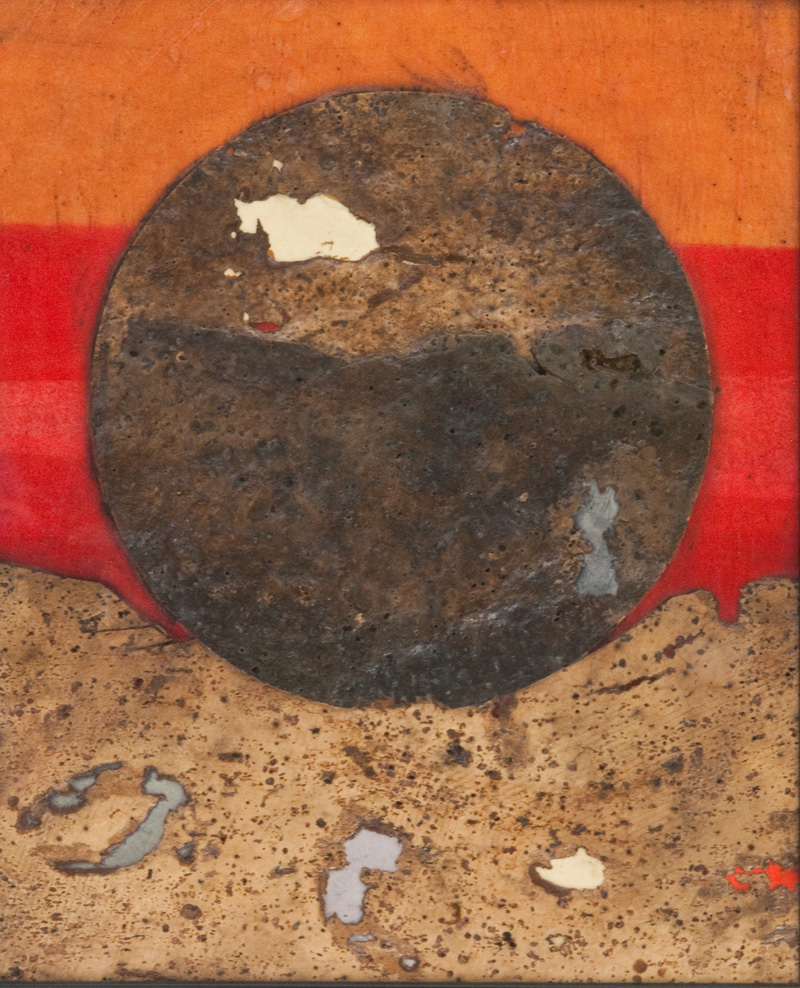 Roberto Crippa Rocks sun, 1969 Sughero e collage su tavola, cm. 46x38 Sul verso: firma, data, titolo; Dedica a "Galleria Giraldi", Livorno; Sigla "Bruno Giraldi"; Timbro "Galleria Pace con Archivio n° 409". Autentica di Roberto Crippa Junior su foto.
