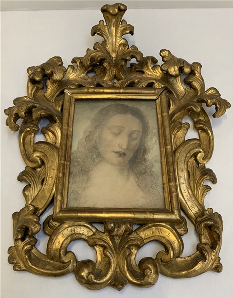 Ignoto "Volto di Cristo" riproduzione a stampa del disegno di Leonardo conservato alla Pinacoteca di Brera (cm 22x17). In cornice intagliata e dorata del secolo XVII