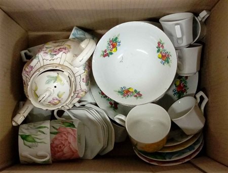 Manifatture diverse, lotto composto da una teiera e numerose ciotole, tazze e piattini con decori diversi in porcellana policroma (difetti)