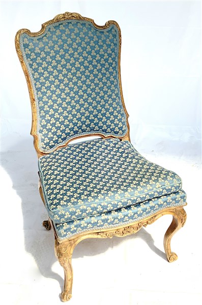 Sedia in mogano intagliato a volute e motivi vegetali, schienale sagomato, fasce e gambe mosse, rivestita in tessuto blu a fiori, secolo XIX (difetti)