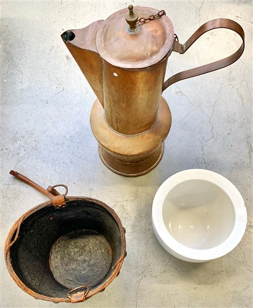 Lotto composto da un porta carbone inglese in cuoio, una grande brocca in rame