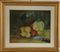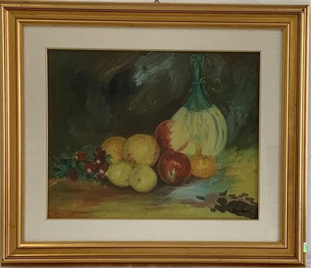 Firma indecifrata "Natura morta con fiasco e frutta" olio su tela (cm 40x50) firmato in basso a destra, in cornice