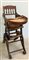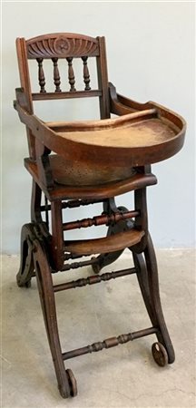Seggiolone per bambino in legno con altezza regolabile, rotelle e parti meccaniche in ferro. Etichetta Alderman, Johnson & Co, fine secolo XIX (h cm 93) (difetti)