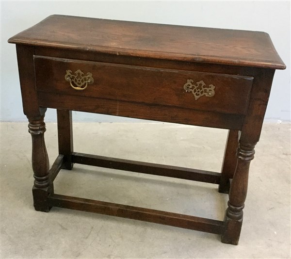 Tavolo da parte ad un cassetto nella fascia con gambe anteriori tornite riunite da traverse, secolo XIX (cm 90x75x39) (difetti e mancanze)