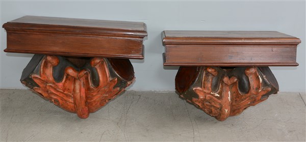 Coppia di comodini pensili con sostegno a forma di tronco d'albero con foglie in legno intagliato e laccato(cm 59x45x29) (gravi difetti)