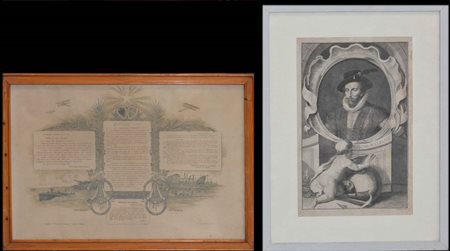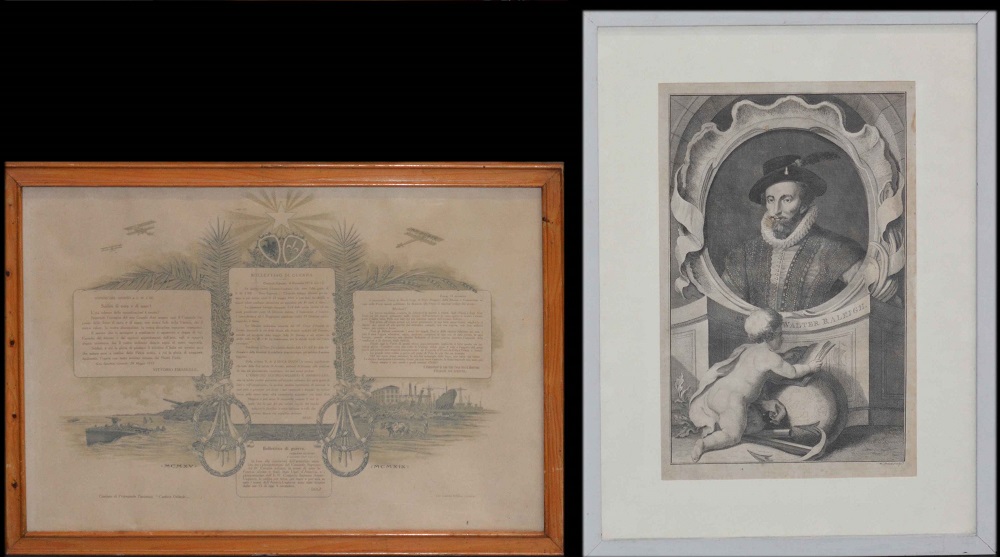 Lotto composto da un'antica incisione rffigurante Walter Raleight e una stampa inerente la prima guerra mondiale, in cornice. (difetti)