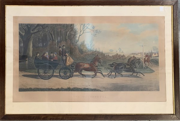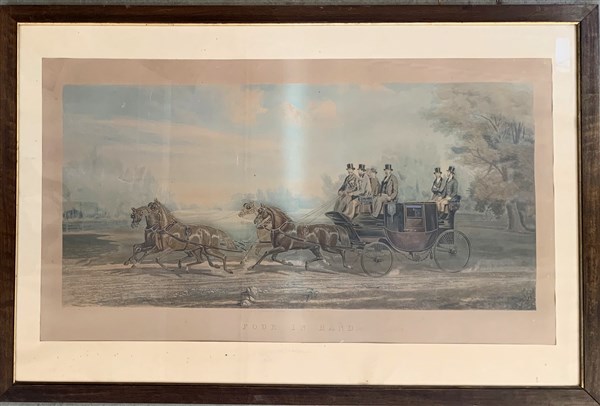 Coppia di stampe inglesi a colori raffiguranti carrozze calessa con cavalli. (55x97, in cornici) (difetti)