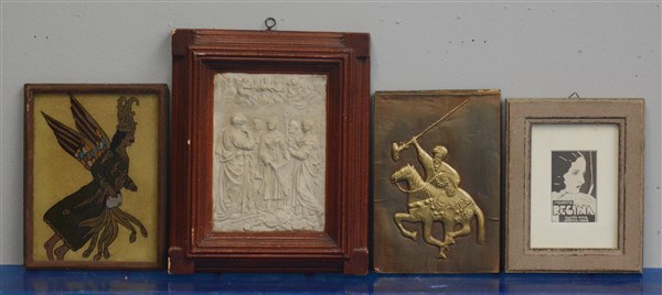 Lotto composto da una stampa pubblicitaria, due rilievi in ceramica e rame e un