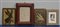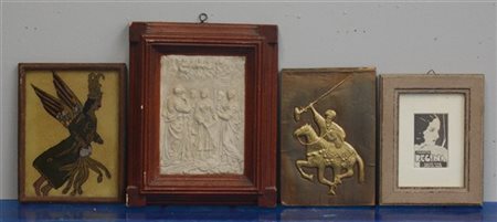 Lotto composto da una stampa pubblicitaria, due rilievi in ceramica e rame e un dipinto su vetro