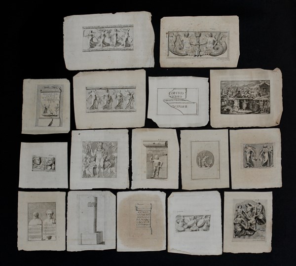 Gruppo di sedici incisioni del secolo XVIII di C. Brun, Vittorio Labrarche, F.A. Gilodi tratte dal volume "Marmora Taurinensia" (misure diverse)