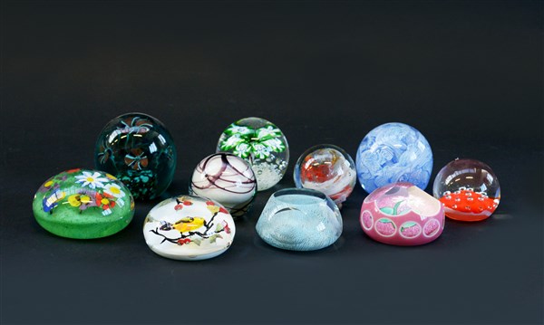 Cartone contenente dieci presse-papiers in vetro e materiali diversi (lievi difetti)