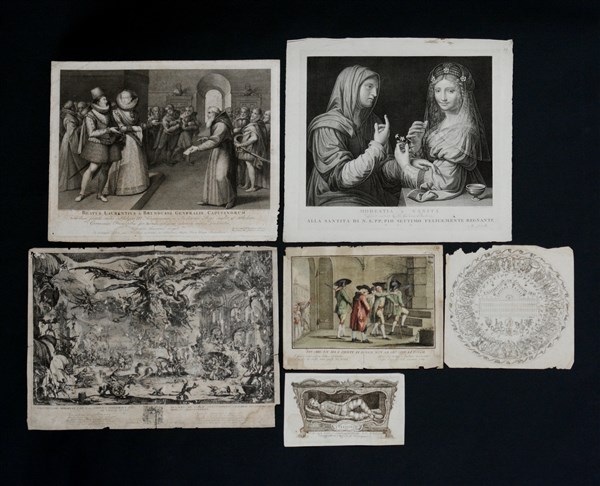 Lotto di 6 incisioni antiche di diversa misura tra le quali ''Le tentazioni di
