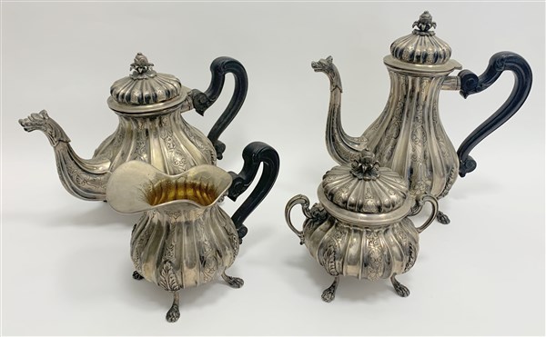 Parte di servizio da tè e caffè composto da teiera, caffettiera, lattiera e zuccheriera in argento a corpo bacellato e inciso a motivi vegetali stilizzati . Decorato alla base da foglie cesellate terminanti a piedini a zampa ferina. Prese dei coperchi decorate da frutto a tutto tondo, manici in legno ebanizzato (gr 1800 lordi) (difetti)