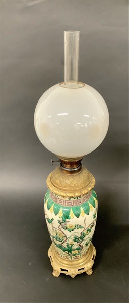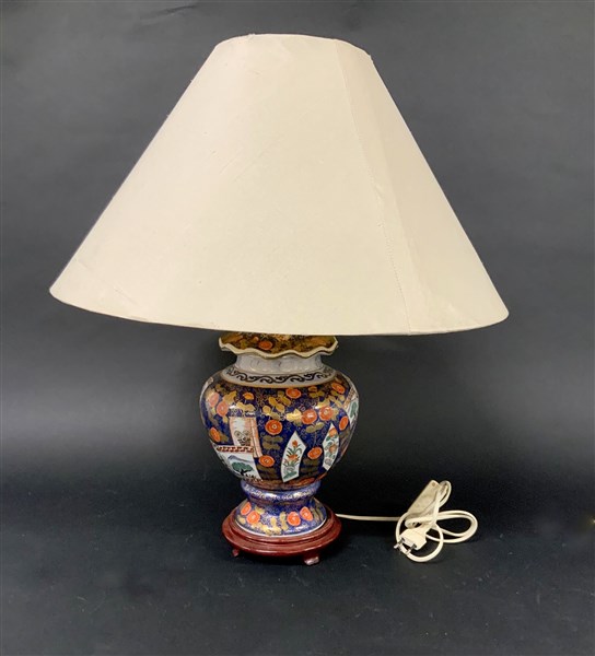 Lotto composto da una lampada ad olio montata in bronzo ed una montata a luce elettrica con fusto a forma di vaso in porcellana policroma a decoro orientale (h max cm 70 ) (difetti)
