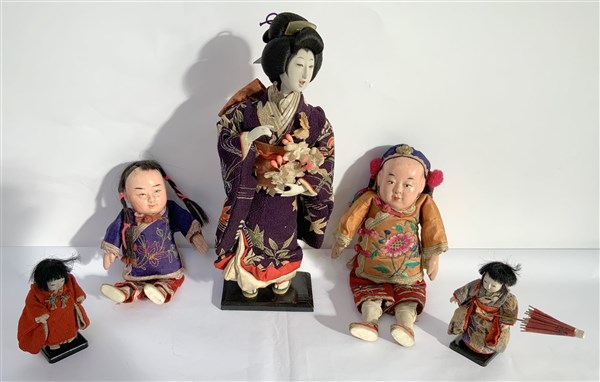 Lotto composto da cinque bambole Manifattura orientale (difetti e mancanze)