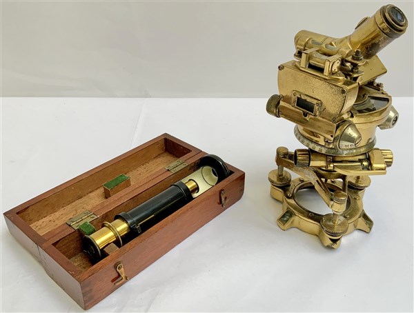 Lotto di due strumenti scientifici composto da un teodolite in ottone e un piccolo microscopio in scatola di legno. Epoca fine XIX - inizio XX secolo (difetti e mancanze)