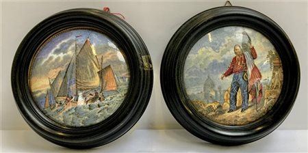 Coppia di tondi in ceramica dipinta raffiguranti Garibaldi e barche a vela, in cornici ebanizzate (d tot cm 14,5) (difetti)