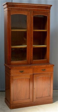 Mobile a due corpi in mogano con parte inferiore a due sportelli e due cassetti ed alzata con vetrina (cm 106x225x50) (difetti e restauri)
