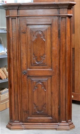 Antica angoliera in noce ad un'anta riquadrata e pannelata (cm 100x184x75) (difetti)