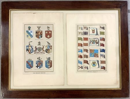 Lotto di due incisioni colorate raffiguranti stemmi e bandiere (cm 35x50), in unica cornice (difetti)