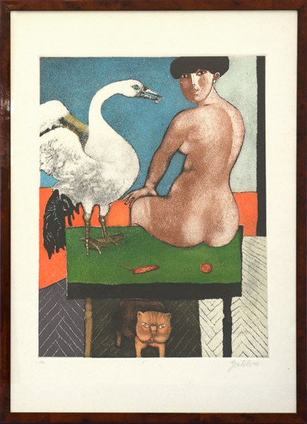 Franco Gentilini "Ippolita e il cigno" acquaforte acquatinta a colori (lastra c