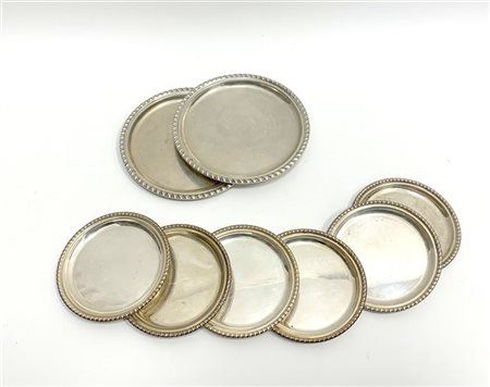Gruppo di otto piattini in argento con bordo cordonato, titolo 800 (gr 450 ca) (d cm 15) (lievi difetti)