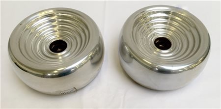 Coppia di lampade da parete modello "Padina". Produzione Flos, Milano, 1966. Alluminio stampato. Recante etichetta adesiva del produttore. (d cm 24) (lievi difetti)