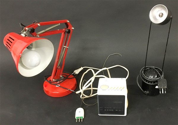 Lotto composto da una sveglia modello "sonoclock 180 SC" produzione Grundig, unito a due lampade da tavolo in metallo rosso e nero. Italia, secolo XX. (misure diverse) (lievi difetti)