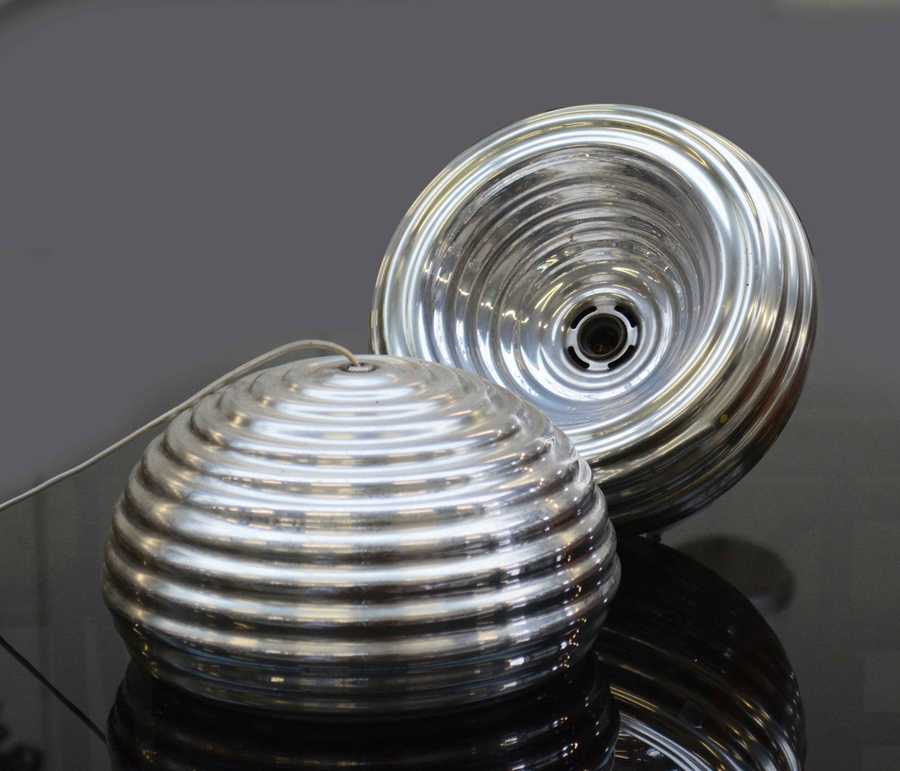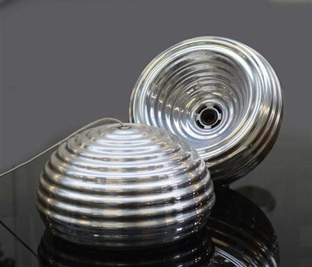 Coppia di lampade a sospensione modello "Splugen Brau". Produzione Flos, Milano, 1961. Alluminio stampato. (d cm 37) (difetti)