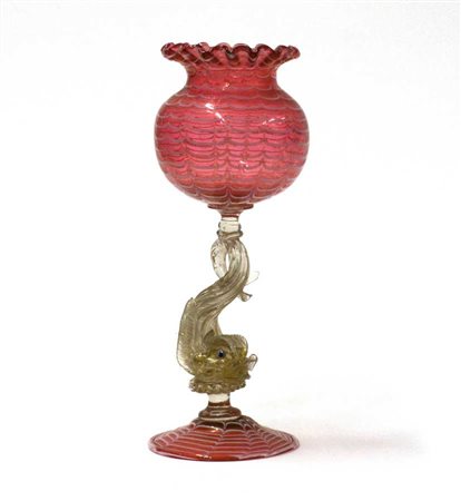 Vaso in vetro soffiato con base e coppa in vetro ametista chiaro e decorato a fasce lattimo con applicazione di foglia d'oro, fusto a foggia di tritone in vetro soffiato trasparente incolore con applicazione di foglia d'oro. Italia, secolo XX. (h cm 35,5) (lievi difetti)