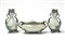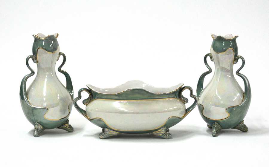 Lotto composto da due vasi ansati ed un centrotavola in ceramica smaltata a lustro metallico nei toni del bianco, verde e oro. Laveno, secolo XX. Marcati con il simbolo grafico della manifattura sotto la base. (vaso cm h 32; centrotavola cm 40x17x20) (lievi difetti)