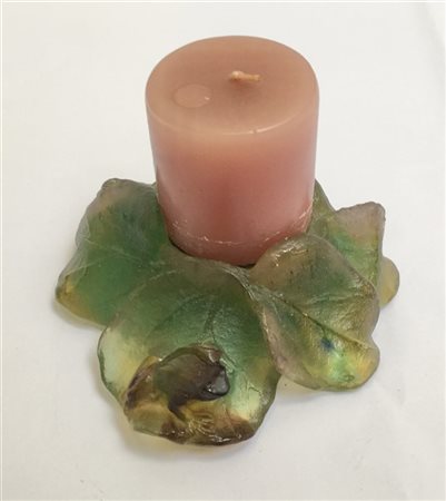 Portacandela in pasta vitrea a foggia di foglie con rana. Nancy, prima metà secolo XX. Firmato a punta "Daum France" sotto la base. (l cm 13) (lievi difetti)