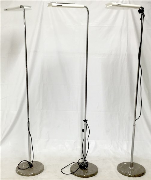 Gruppo di tre lampade da terra modello "Mezzaluna". Produzione Skipper, Italia, 1975. Diffusore in metallo laccato bianco, fusto in acciaio cromato, base in marmo grigio venato. (altezza regolabile)