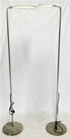 Coppia di lampade da terra modello "Mezzaluna". Produzione Skipper, Italia, 1975. Diffusore in metallo laccato bianco, fusto in acciaio cromato, base in marmo grigio venato. (altezza regolabile)