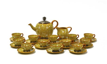 Servizio da the composto da teiera, lattiera e dodici tazzine con piattini in ceramica gialla e arancione smaltata con base in argento titolo 800. Pesaro, anni '50. Simbolo grafico della manifattura sotto la base.