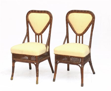 Coppia di sedie in vimini con seduta e schienale in stoffa a righe. Prima metà secolo XX. (cm 46x95x54) (difetti)