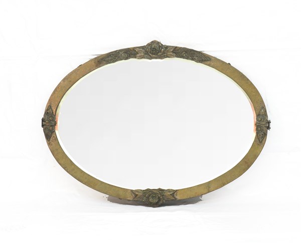 Specchiera ovale con cornice in rame martellinato con applicazione floreali in fusione di bronzo in rame. Secolo XIX/XX. (cm 60x83) (lievi difetti)