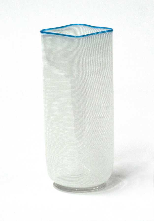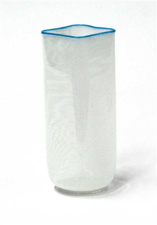 Vaso in vetro soffiato trasparente incolore a mezza filigrana lattimo con orlo superiore in vetro soffiato azzurrino applicato a caldo. Murano, anni '90/2000. Recante etichetta adesiva. (h cm 24)