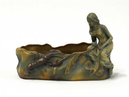 Centrotavola di gusto liberty in ceramica smaltata sottovetrina nei toni del verde e dell'ocra raffigurante una figura femminile e una aragosta. Marcata sotto la base e con il numerale. (cm 36x22x18)