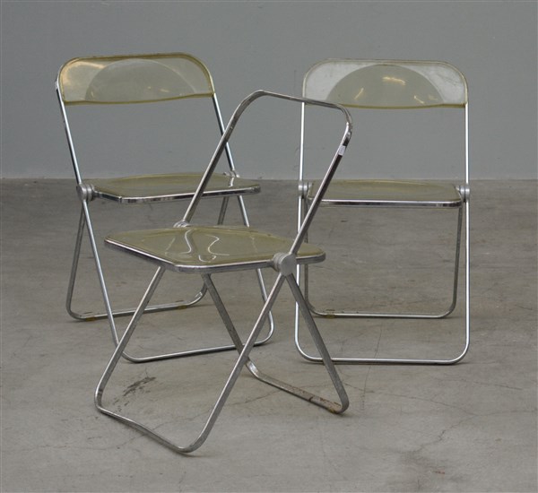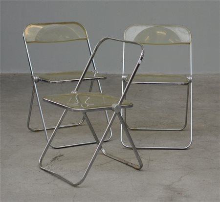 Tre sedie pieghevoli modello "Plia". Bologna, anni '70. Tubolare in alluminio cromato, seduta e schienale in materiale plastico Cellidor. (cm 47x74x47,5) (difetti e mancanze)