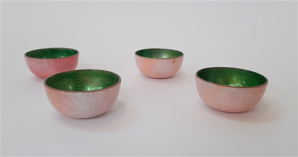 Lotto composto da quattro ciotoline in rame smaltato in rosa e verde. Padova, anni '50/'60. Firmate sotto la base. (h cm 3; d cm 6,5) (difetti)
