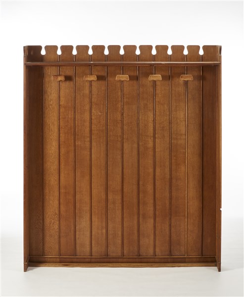 Appendiabiti da parete ad incasso in legno di rovere massello con cinque appendini e cappelliera. Cantù, anni '40/'50. (cm 170x195x30) (lievi difetti)