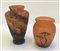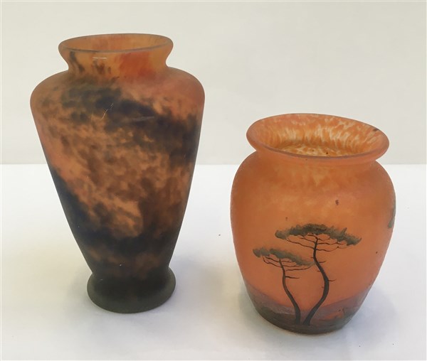Lotto composto da un vasetto in pasta vitrea arancione e bruno e un vasetto in vetro a cammeo inciso all'acido e dipinto a mano raffigurante un paesaggio. Luneville, prima metà secolo XX. Firmati alla base. (h max cm 18)