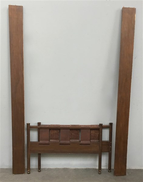 Letto singolo con struttura in legno, testiera e pediera decorata a fasce in cuoio marrone. Italia, secolo XX. (difetti)