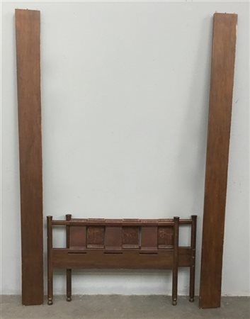Letto singolo con struttura in legno, testiera e pediera decorata a fasce in cu