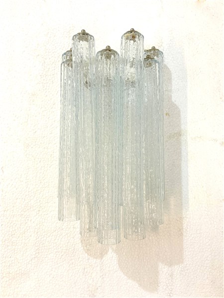 Lampada da parete con struttura in metallo verniciato bianco, pendenti cilindrici in vetro soffiato incolore corrugato unito a un lampada a sospensione di medesima fattura. Anni '70. (lampada da parete h cm 46; lampada a sospensione h cm 32, d cm 30) (lievi difetti e mancanza di un pendente di lunghezza maggiore)