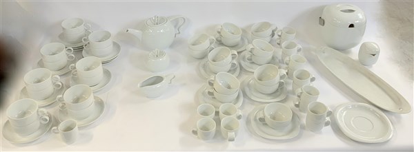 Lotto composto da una teiera, una zuccheriera e una lattiera di Lino Sabattini per Rosenthal, parte di servizio della serie "Suomi" di Timo Sarpaneva per Rosenthal Studio Linee composto da sedici tazzine da caffé, quindici tazze da te, sette piattini, una biscottiera e una lattiera, da parte di servizio di Ambrogi Pozzi per Rosenthal Studio Linee composto da quattordici tazze da tè, 1 da caffè e undici piattini unito a un vassoio di analoga fattura. Germania, anni '80. Porcellana smaltata bianca. Marcati sotto la base. (lievi difetti)