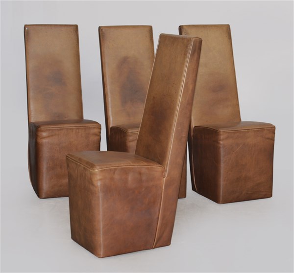 Lotto composto da quattro sedie imbottite e rivestite in pelle marrone. Italia, anni '90/2000. (cm 39x103x61) (difetti)
