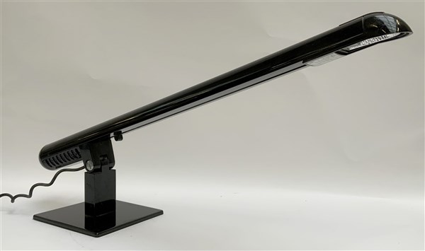 Lampada da tavolo modello "Concorde". Produzione Skipper, Italia, anni '80. Struttura in metallo verniciato nero. Recante etichetta adesiva del produttore. (altezza regolabile, l cm 80) (lievi difetti)